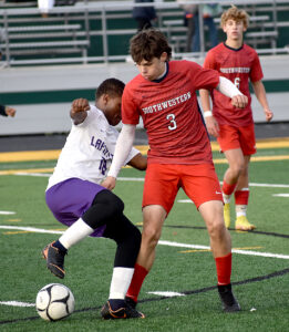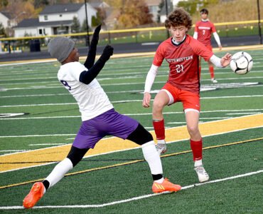 - the Trojans’ Nolan Froah battles the Generals’ Benjamin Wilondja for possession. P-J photo by Matt Spielman