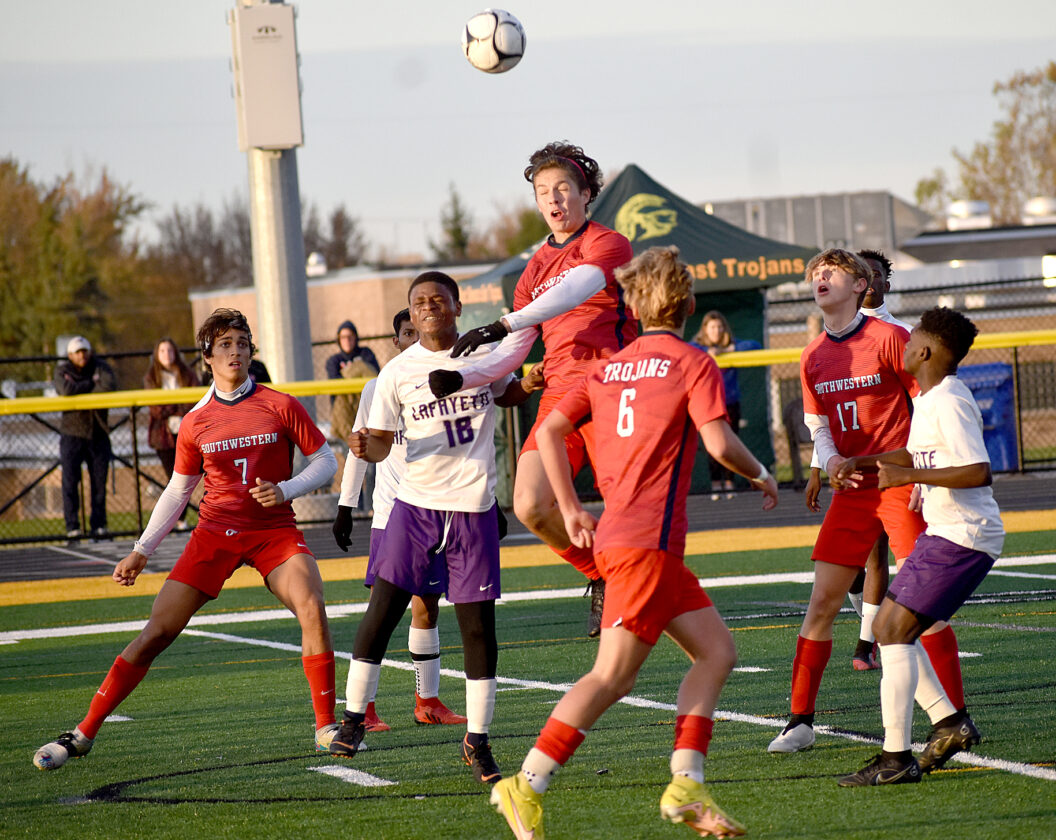 - Southwestern’s Spencer Bell, center, goes up for a header off a corner kick during Friday’s Section VI Class B2 championship game against Lafayette at West Seneca East High School in Buffalo.