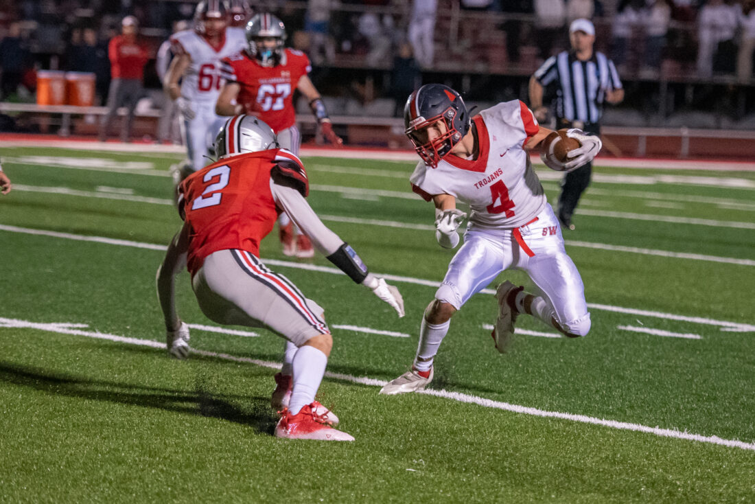 But the Warriors returned the favor on Southwestern’s next drive. On third-and-17 from the Trojans’ 35-yard line, Walsh threw deep to Cameron Lemk, who looked like we was well covered by a pair of Salamanca defenders, but somehow came away with the 41-yard catch to set up Arrington’s eventual go-ahead score.