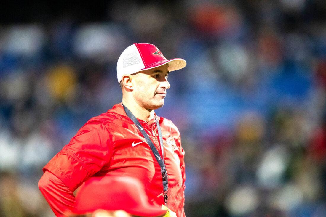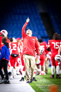 - Red Raiders head coach Tom Langworthy points to the sky at Highmark Stadium Thursday night. P-J photo by Tim Frank