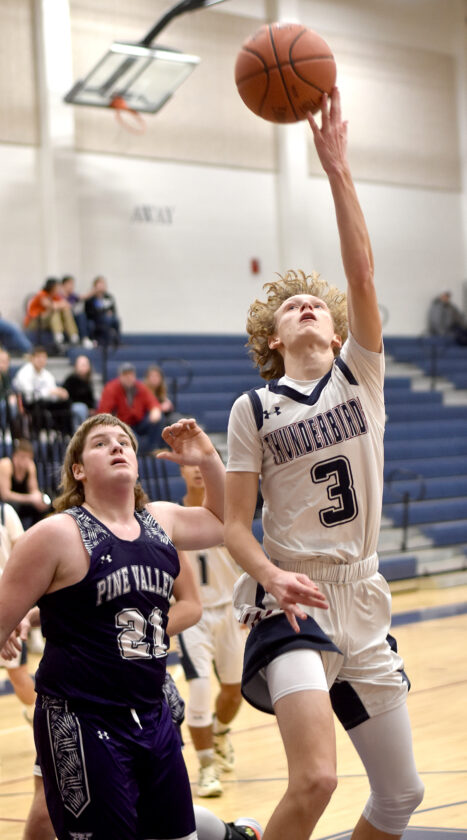 The Thunderbirds then began their rally as Jacobson scored in the lane and senior Ethan Testa followed with back-to-back baskets to tie the game at 35-all with 5:52 left. Jacobson then hit his only two 3-pointers of the night sandwiched around a pair of free throws by Pine Valley’s Jon Sheldon to give Chautauqua Lake a 41-37 lead.