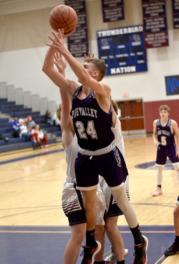 Pine Valley’s Miles Volk puts up a shot in traffic during Monday’s nonleague basketball game at Chautauqua Lake. P-J photo by Matt Spielman