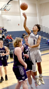 - Pine Valley’s Miles Volk puts up a shot in traffic during Monday’s nonleague basketball game at Chautauqua Lake. P-J photo by Matt Spielman