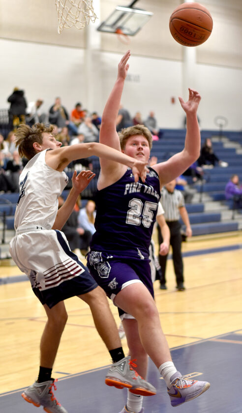 - Chautauqua Lake’s Kaden Brushaber and Pine Valley’s Collin Gregory battle for a rebound during Monday’s nonleague game at Chautauqua Lake. P-J photo by Matt Spielman