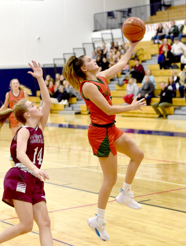 - Jamestown’s Marley Drake scores on a reverse layup in front of Sacred Heart’s Mariah Huss during the second game of the Southwestern Tournament on Friday night at Southwestern Central School. P-J photo by Matt Spielman