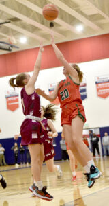 - Jamestown’s Alyson Canfield puts up a shot in the lane against Sacred Heart during the Southwestern Tournament on Friday night at Southwestern Central School. P-J photo by Matt Spielman