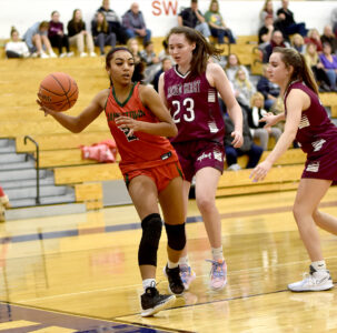 - Jamestown’s Mickia Freeney looks to make a pass along the baseline while Sacred Heart’s Meghan Trapper (23) and Brooke Personius defend during the second game of the Southwestern Tournament on Friday night at Southwestern Central School. P-J photo by Matt Spielman