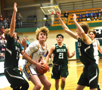 Clymer’s Jonathan Massing gets ready to go up for a basket between North Collins defenders Walter Ebersole, left, and Daniel Downes, right, during Monday’s Section VI Class D semifinal at the Physical Education Complex at Jamestown Community College. P-J photo by Christian Storms