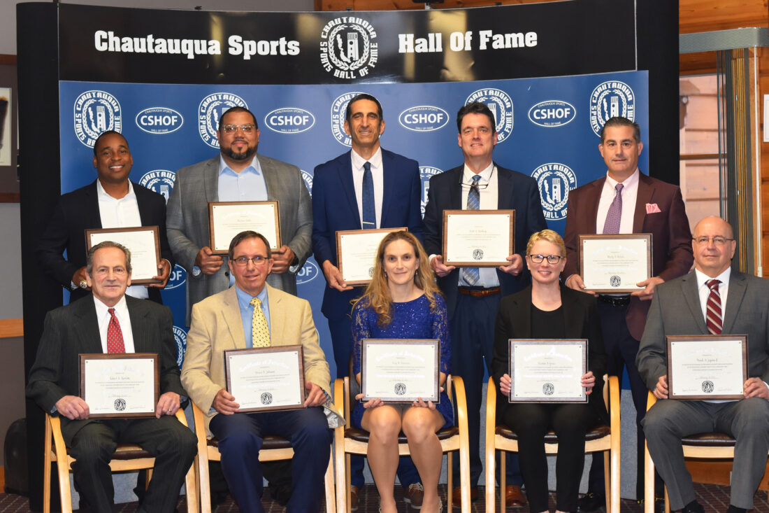Monday’s inductees into the Chautauqua Sports Hall of Fame, pictured above, in front from left, are: Robert Barlette, Bruce Johnson, Amy (King) Swanson, Kirsten Green and Frank Jagoda II. In back are: David Hinson, Sheldon Battle, Jay Sirianni, Scott Kindberg and Marty Nichols. Not pictured is Fred Larson. P-J photo by Christian Storms