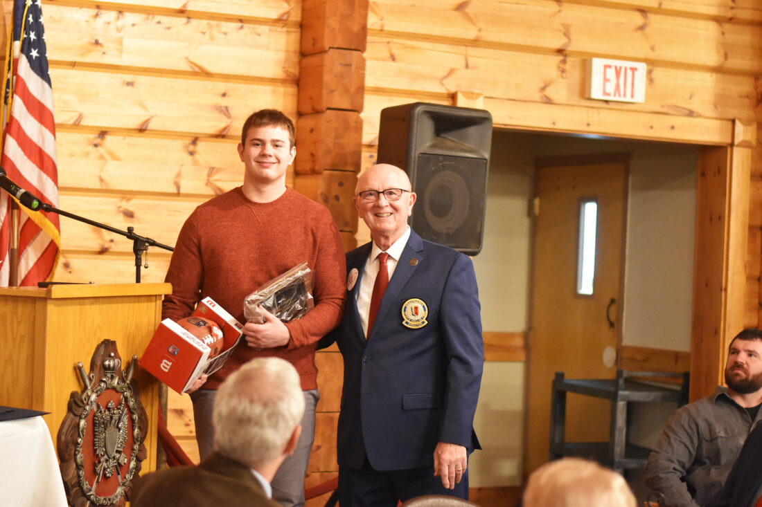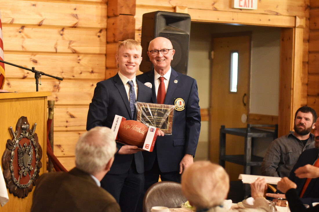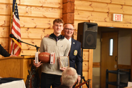 - Clymer/Sherman/Panama’s Bryce Hinsdale is honored by Randy Anderson, President of the Chautauqua Sports Hall Of Fame, for being selected as a First-Team All-State football player in the fall. Photo by Cameron Hurst