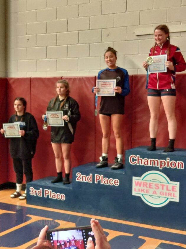 Mia Smith of Chautauqua Lake, right, and Ke’ya Stevens of Gowanda, second from right, finished one-two in the Intersectional Girls Wrestling Championships on Saturday at Chautauqua Lake Central School. Submitted photo