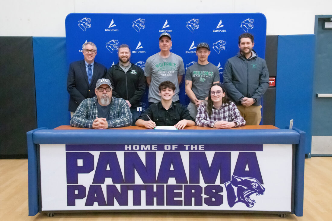 Prior to the start of his senior season on the diamond, Panama’s Gabe Roth signed his national letter of intent to attend St. John Fisher College in Rochester and play baseball for the Cardinals. Pictured, in front, from left, are: Scott Roth, Gabe’s father; Gabe Roth; and Jordan Oney Roth, Gabe’s sister. In back are: Aaron Wolfe, Panama superintendent; Evan TeCulver, Clymer/Sherman/Panama assistant coach; Dane Simmons, Clymer/Sherman/Panama assistant coach; Jake Marino, Clymer/Sherman/Panama head coach; and Scott Costantini, Panama principal.