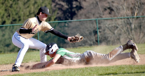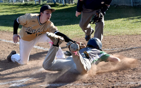 - Clymer/Sherman/Panama’s Austin White slides under the tag of Silver Creek/Forestville’s Thomas Hogg to steal second base during Monday’s nonleague game in Panama. P-J photo by Matt Spielman