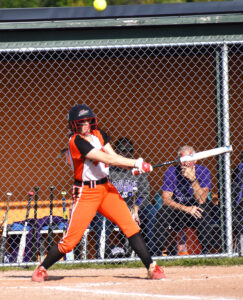 - Fredonia’s Jenna Truby fouls off a pitch during Thursday’s quarterfinal against Royalton-Hartland. P-J photo by Christian Storms