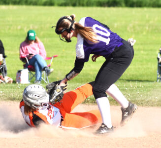 - Dunkirk’s Callie Draggett successfully steals second base ahead of the tag by Royalton-Hartland shortstop Kaitlin Mettler during Thursday’s Section VI Class B2 quarterfinal. P-J photo by Christian Storms