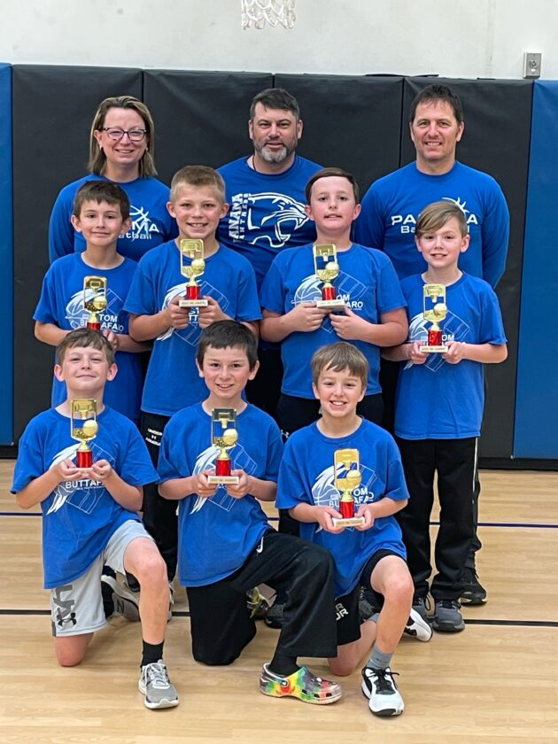 The Panama Blue boys basketball team completed an undefeated YMCA basketball season and was crowned the champions of the 3rd-4th Grade Division. Pictured, in front, from left, are: Patrick Warner, Walker Eggleston and Dylan Brink. In the middle are: Matthew Kolstee, Hunter Roberts, Ryan Bimber and Cameron Ruch. In back are: Coach Pamela Warner, Coach Adam Eggleston and Coach Rod Brink.