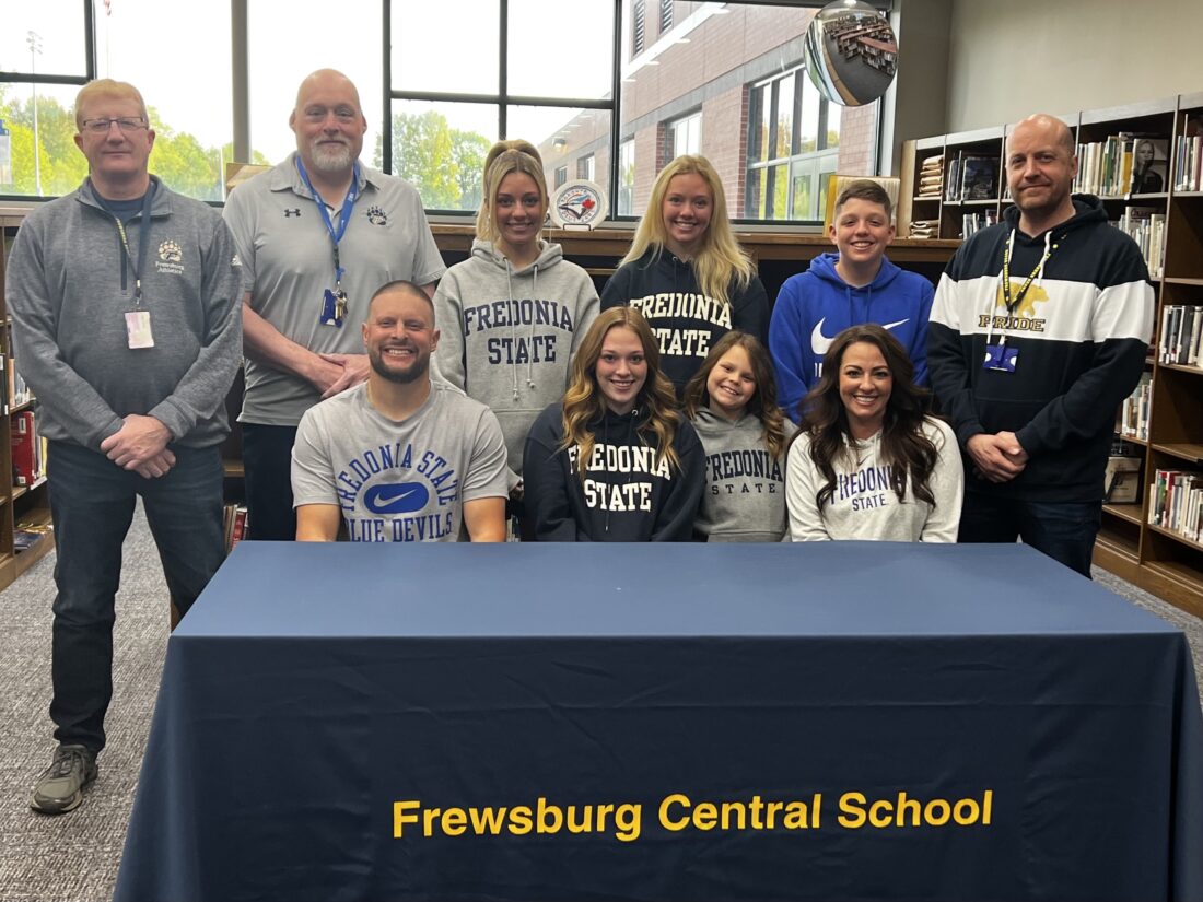 Three-time Post-Journal/OBSERVER Girls Soccer Player of the Year, Frewsburg’s Alexander Hultberg, flanked by coach and step-father Scott Stone, sister Alivia Hultberg, and mother Leslie Stone, has signed her commitment to further her academic and athletic career at SUNY Fredonia. Joining in support, standing in the back from left, are guidance counselor Randy Sitler, athletic director Terry Gray, sisters Ava and Addison Hultberg, brother Isaac Hultberg and principal Josh Gilevski.