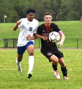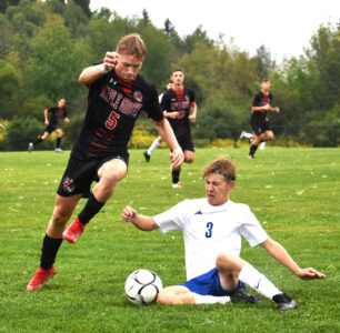 - Westfield/Brocton’s Mahir Patel, left, and Maple Grove’s Gavin Rodgers battle for possession. P-J photo by Christian Storms