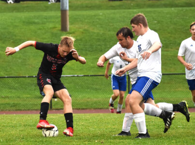 - Wolverines’ Carson Swanson fights off Maple Grove’s Trey DeMink and strikes past for the opening goal in Tuesday’s CCAA Central soccer game in Bemus Point. P-J photo by Christian Storms