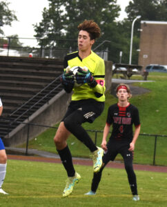 - Maple Grove goalkeeper Nathan Cresanti stops a penalty kick during Tuesday’s Chautauqua-Cattaraugus Athletic Association Central Division soccer game against Westfield/Brocton. P-J photo by Christian Storms