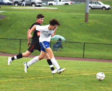 - Westfield/Brocton’s Austin McIntyre (7) and Maple Grove’s Trey DeMink (8) race toward a ball in the first half of Tuesday’s CCAA Central soccer game in Bemus Point. P-J photo by Christian Storms