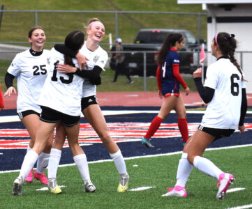 - Allegany-Limestone’s Cait Kellogg is embraced by teammate Addie Fisher after scoring the go-ahead goal in Monday’s game at Charles A. Lawson Field. P-J photo by Christian Storms