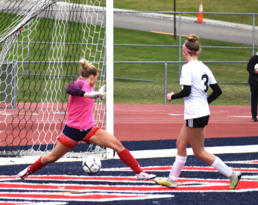 - Allegany-Limestone’s Cait Kellogg slips the game-winning goal past Southwestern’s Braya Beaver in Monday’s CCAA D1 West match at Charles A. Lawson Field. P-J photo by Christian Storms