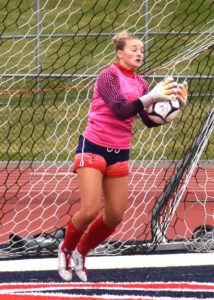 - Southwestern goalkeeper Braya Beaver collects a save during Monday’s CCAA D1 West match against Allegany-Limestone at Charles A. Lawson Field. P-J photo by Christian Storms