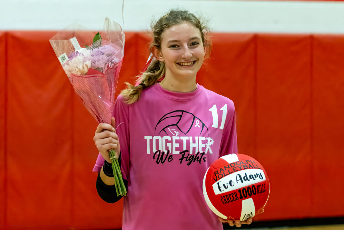 - Randolph senior Eve Adams holds flowers and a ceremonial ball after reaching 1,000 career kills Wednesday in a CCAA East Division girls volleyball match against Silver Creek. Photo by Mike Frame
