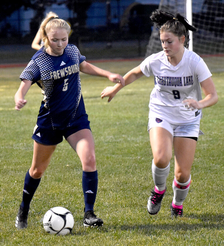 - Chautauqua Lake’s Paige Zarpentine, left, attempts to steal the ball from Frewsburg’s Kealy Caflisch during Monday’s CCAA Division 2 West girls soccer game in Frewsburg. P-J photo by Matt Spielman