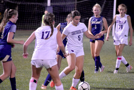 - Chautauqua Lake’s Taylor Donato (5) protects the ball from Frewsburg’s Kaylee Cappa, while the Bears’ Jadyn Trocki (3) and Addison Hultberg (4) as well as the Thunderbirds’ Paige Zarpentine (17) and Jada Cole (14) look on during Monday’s CCAA Division 2 West girls soccer game in Frewsburg. P-J photo by Matt Spielman