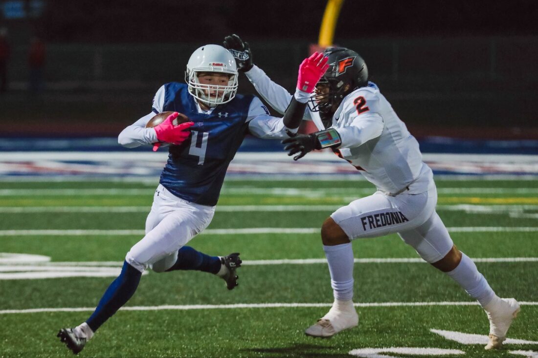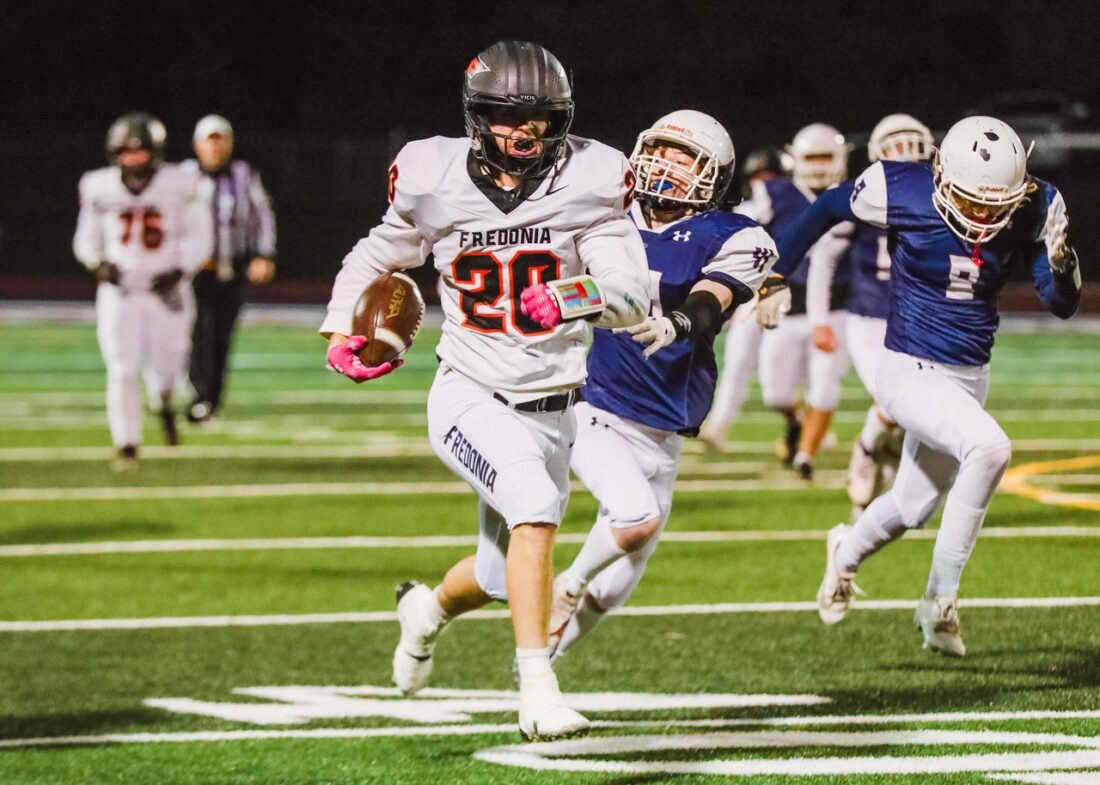 - Fredonia’s Sam Atzrott (20) finds plenty of running room during Thursday’s Section VI Class C Chuck Funke Bowl final against Chautauqua Lake/Westfield/Brocton at Chautauqua Lake Central School. P-J photo by Ashleigh Brown