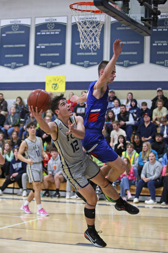 - Falconer’s Roger Markham looks to score after being fouled by Cassadaga Valley’s Hunter Johnson during Monday’s Chautauqua-Cattaraugus Athletic Association Division 1 East game in Falconer. Photo courtesy of Steve Garvey