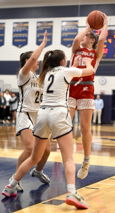 Randolph’s Skylar Herington shoots a jumper over Frewsburg’s Teghan Trocki (2) and Ava Jimerson (24) during Friday’s CCAA Division 1 East game in Frewsburg. P-J photo by Matt Spielman
