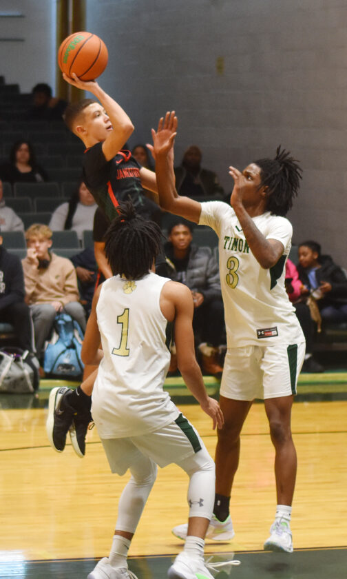 - Jamestown’s Jaydian Johnson put up a shot over Bishop Timon defenders during Saturday’s nonleague basketball game at Bishop Timon High School. P-J photo by Scott Kindberg