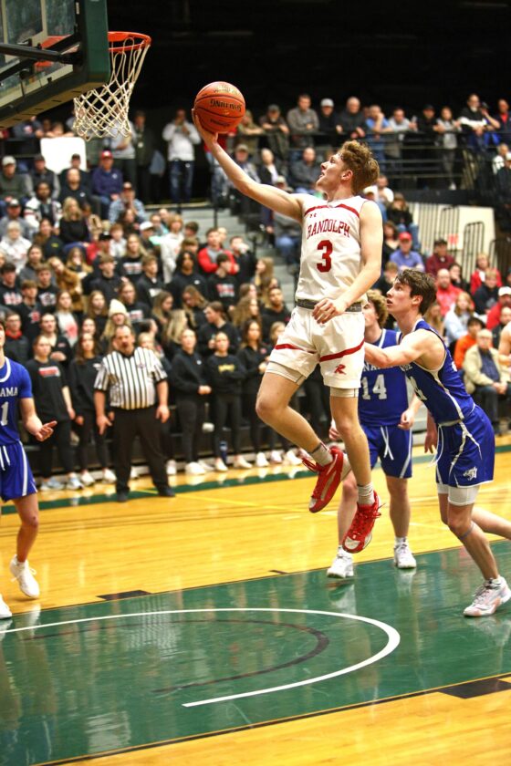 - Randolph’s Drew Hind lays in two of his 34 points in Tuesday’s Section VI Class C semifinal. Photo courtesy of Steve Garvey