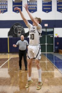 - Frewsburg senior Gavin Smith hits a 3-point shot to become the Bears’ all-time leading scorer in Tuesday’s CCAA D1 East victory over Falconer. Photo by Barb Flood