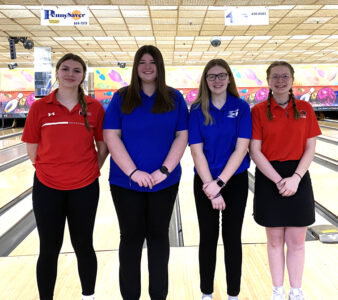 Pictured are the top individual performers at the CCAA Roll-Offs. From left to right are High Individual Handicap series, Randolph’s Alyssa Milks; High Individual Handicap Game, Hinsdale’s Analia Degroff; High Individual Scratch Series, Hinsdale’s Madison Rondeau; and High Individual Scratch Game, Jamestown’s Abbie Derby. P-J photo by Christian Storms