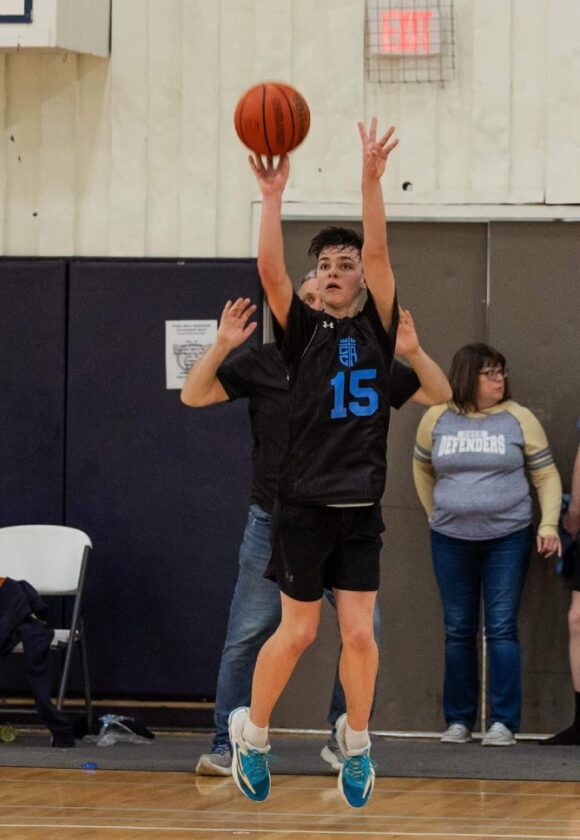 Chautauqua Christian Academy’s Sawyer Lynn shoots his go-ahead 3-pointer in the final minute of overtime to lead the Defenders to a 67-60 win over Faith Christian of West Virginia in the consolation game of the National Christian School basketball tournament. Submitted photo
