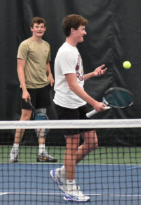 Maple Grove’s Fletcher, in back, and Trey DeMink practice at the Lakewood YMCA earlier this week. The pair will play in the NYSPHSAA championships this weekend at the USTA National Tennis Center in Flushing. P-J photo by Scott Kindberg