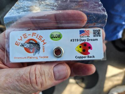 - The dipsy-diver hot lure of the day was the Eye-Fish spinner/worm in Day-Dream color with a copper back.