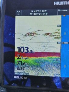 - When the boat reached 89 feet of water depth, the Humminbird sonar screen filled up with the “show-tell” curvy marks of suspended fish (walleye) at 60 feet. Captain Dennis Young ran a circular trolling pattern near this school to catch hungry walleye.
