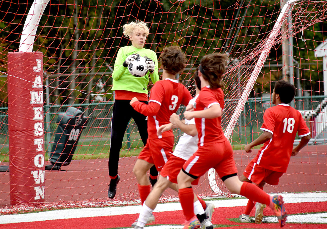 Jamestown’s Evan Maloney makes a save during Monday’s CCAA Division I boys soccer game against Southwestern at Strider Field. P-J photo by Matt Spielman