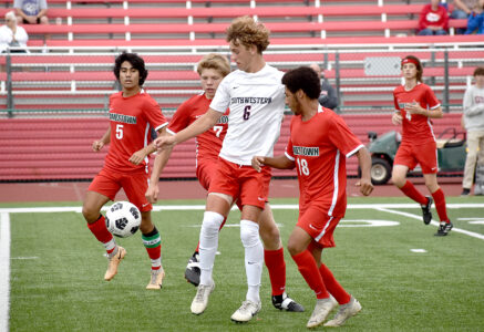 - Southwestern’s Connor Young is surrounded by three Jamestown defenders: Jaren Cotter (5), Cameron Burgess (7) and Tavion Goodlow (18) during Monday’s CCAA Division I boys soccer game at Strider Field. P-J photo by Matt Spielman