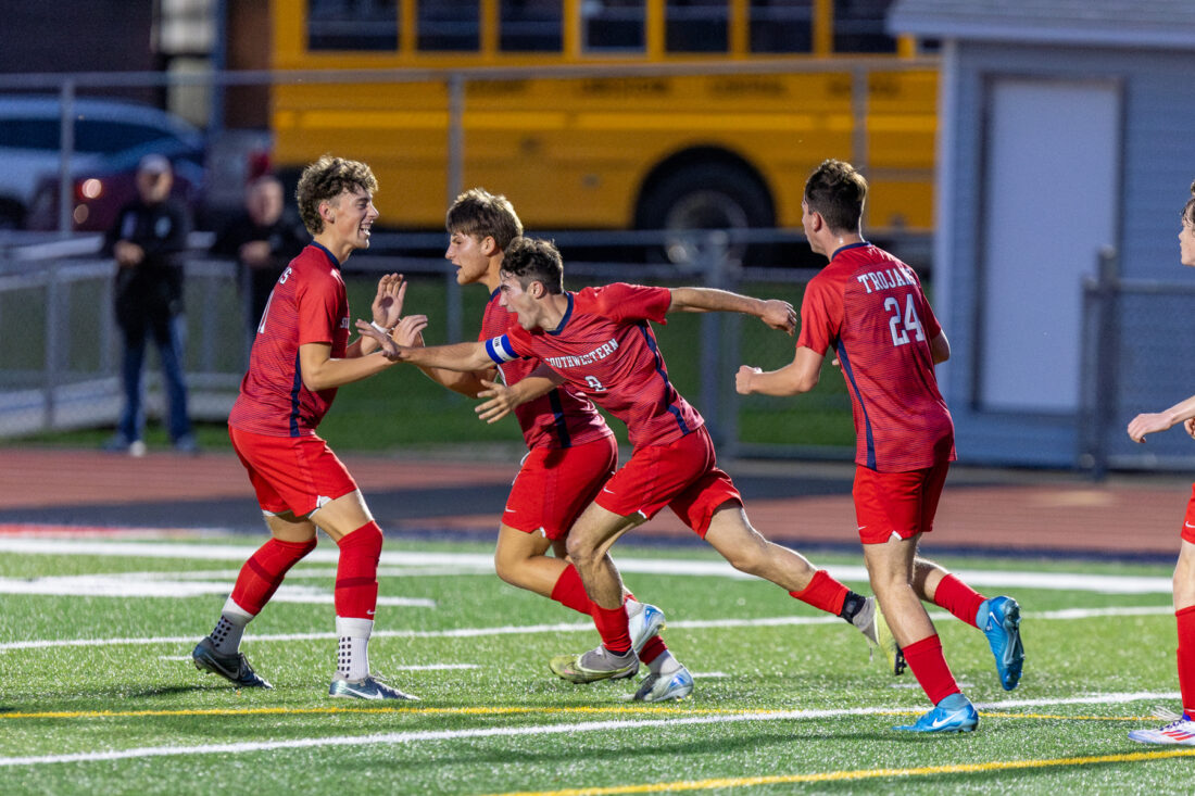 - Southwestern celebrates a goal by Seth Vaughn, center. P-J photo by Tim Frank