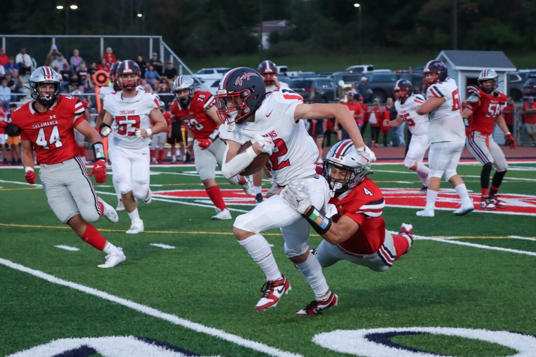 - Salamanca’s Cory Holleran looks for room to run as Southwestern’s Kole Lyon (51) closes in during Section VI Class C South football action at Charles A. Lawson Field on Friday. At left is the Trojans’ Colton Waite (17). Photo courtesy of Shelly Phillips