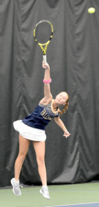- Falconer’s Myla Brainard serves to her opponent during the Section VI girls tennis championships Friday at the Lakewood YMCA. P-J photo by Matt Spielman