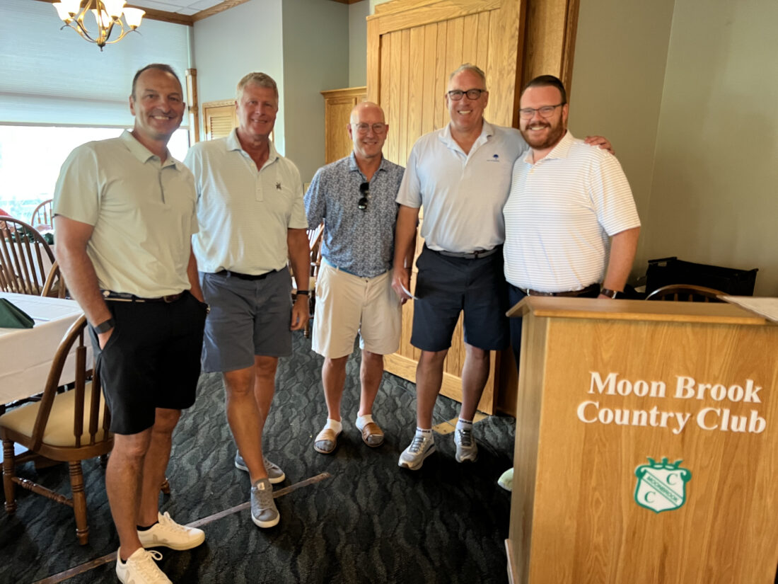 Pictured, from left, are: Hans Auer, Roy Glosser, Tom Holt and Tim Shults, who won the 2-Best-Ball-of-4 Division of the Rotary Club of Jamestown’s 30th annual Rotary Charity Golf Tournament at Moon Brook Country Club. They are being congratulated by MBCC pro Ben Windoft.