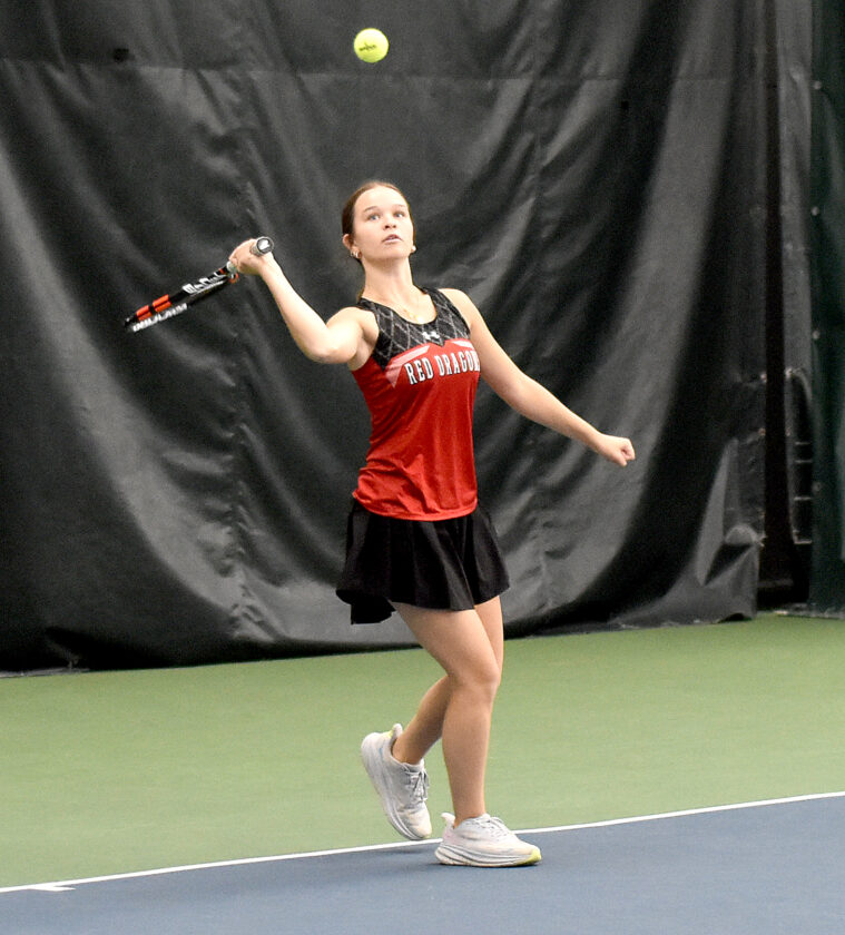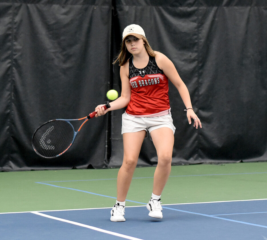 - Maple Grove’s McKenzie Anderson lines up a return during the CCAA Tennis Doubles Championships on Thursday at the Lakewood YMCA. P-J photo by Matt Spielman