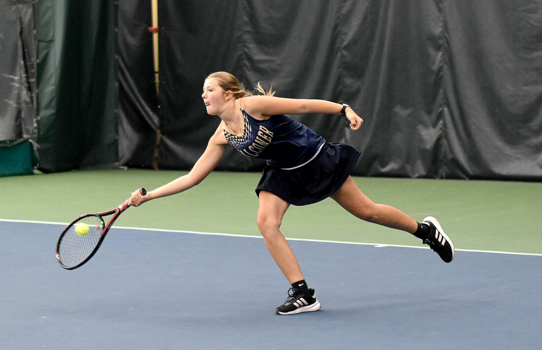- Falconer’s Jenna Bellinger reaches for a shot during the CCAA Tennis Doubles Championships on Thursday at the Lakewood YMCA. P-J photo by Matt Spielman